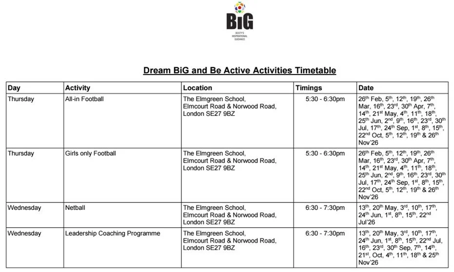 the ‘Dream BiG and be Active’ project will deliver a comprehensive sports and mentoring programme designed to improve physical, emotional, and mental wellbeing. we will also be offering opportunities for children and young people to register onto our mental wellbeing workshops!